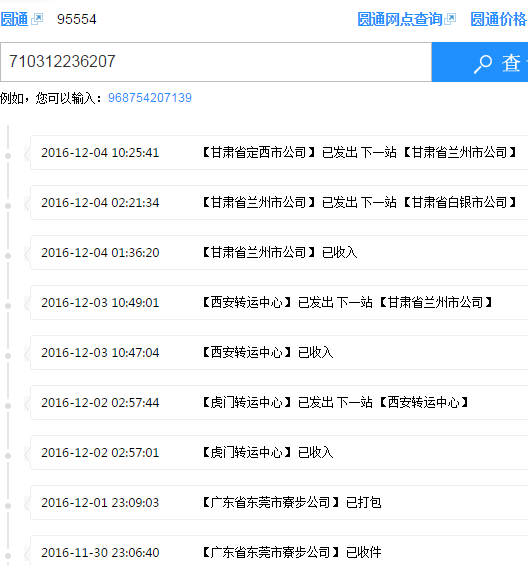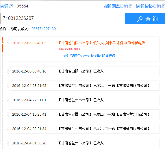 圓通快遞 運單號 710312236207一般3到4天收到貨,現(xiàn)在7天沒收到。原因是圓通甘肅甘肅把我發(fā)白銀的貨發(fā)定西去了,從定西發(fā)回蘭州。再發(fā)白銀,蘭州離白銀70公里走了34個小時。大圓通95554電話聯(lián)系干脆拒接。我不明白這樣的公司怎么還能生存。行走路線截圖給大家看看。